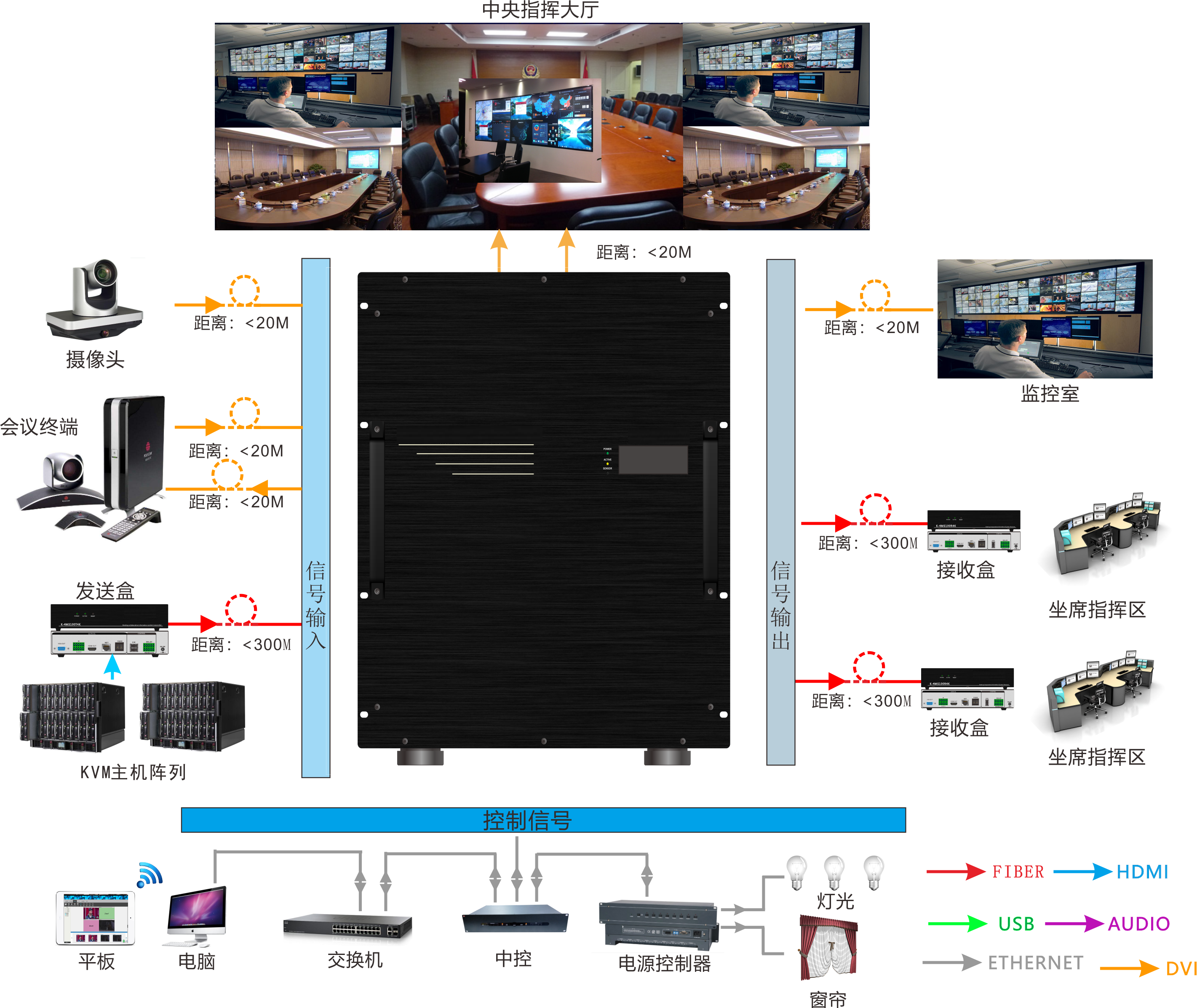 圖像處理器提供大幅面高分辨率的圖形顯示環境,使活動視頻、RGB信號窗口等各種類型的圖像信號以及全息超高分辨率的應用圖像均可以在顯示拼墻上完美重現。本方案設計為提供48路RGB\DVI信號輸出,28路RGB\DVI信號輸入,12路復合視頻信號源輸入。